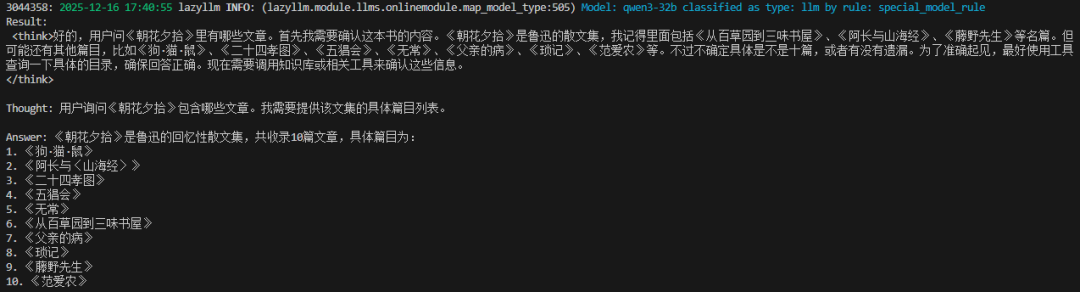 Agentic RAG 就是引入了 AI 智能体的 RAG,这里让我们用 LazyLLM 来注册一个假的知识库搜索工具,实现一个 React: