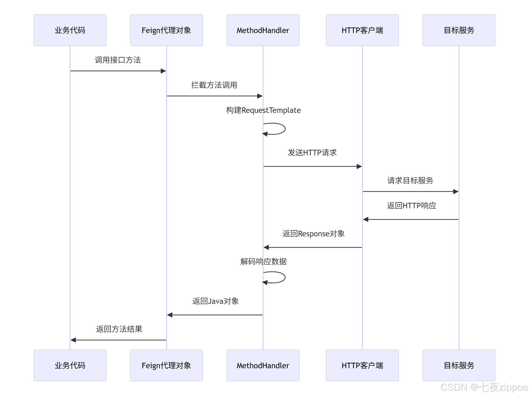 OpenFeign的核心在于运行时动态代理,将接口方法调用转换为HTTP请求: