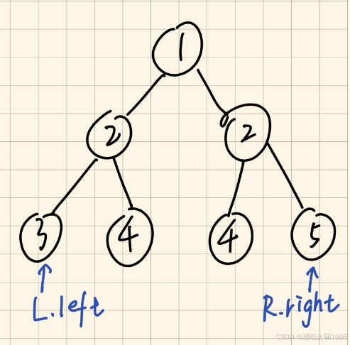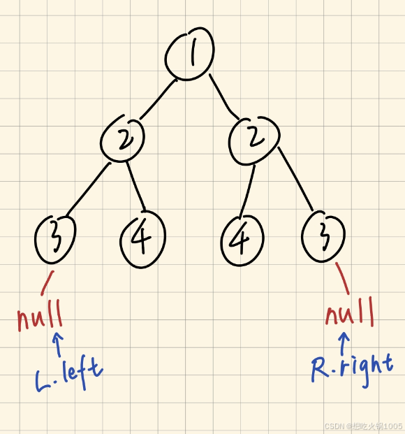 然后是确定终止条件。这里我们需要分情况讨论。因为我们是判断一个二叉树是否对称,所以就不能只是单纯的比较左孩子和右孩子是否相等,这个只能在根节点的时候是有用的,再往下就不能这么做了。那要看下面的是否对称,我们要对比的就是L.left和R.right(假设L指向左节点,R指向右节点)。这里又可以再分情况来讨论我们的终止条件了: