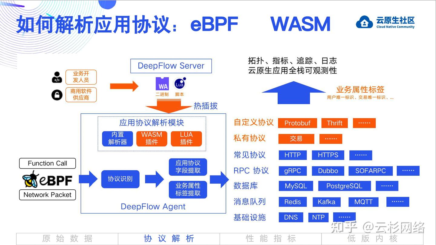 特别提一下,对私有协议的识别,通过结合 eBPF 和 WebAssembly 的能力,提供一个灵活的插件机制。插件在 DeepFlow 中解决两个问题:提供对私有协议的解析能力,提供对任意协议的业务字段解析能力。