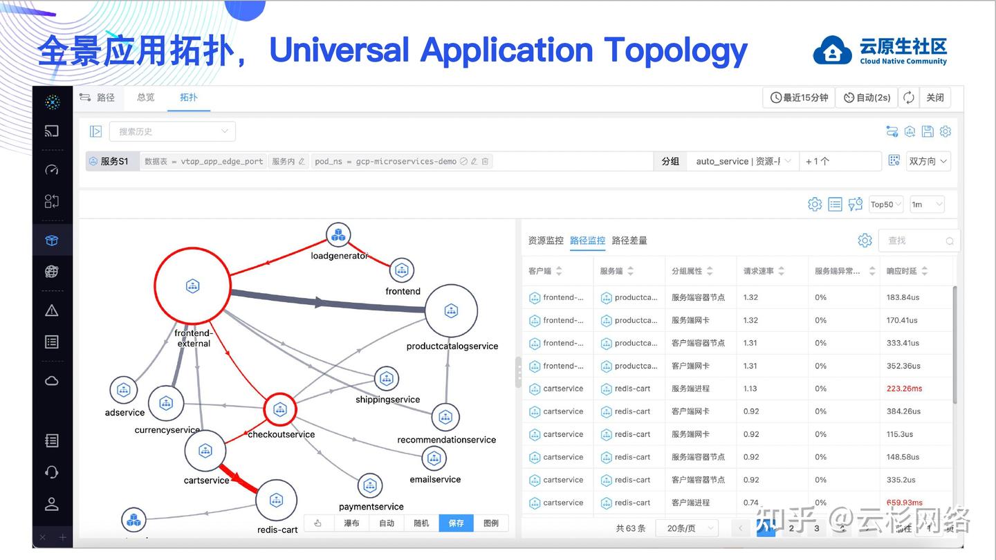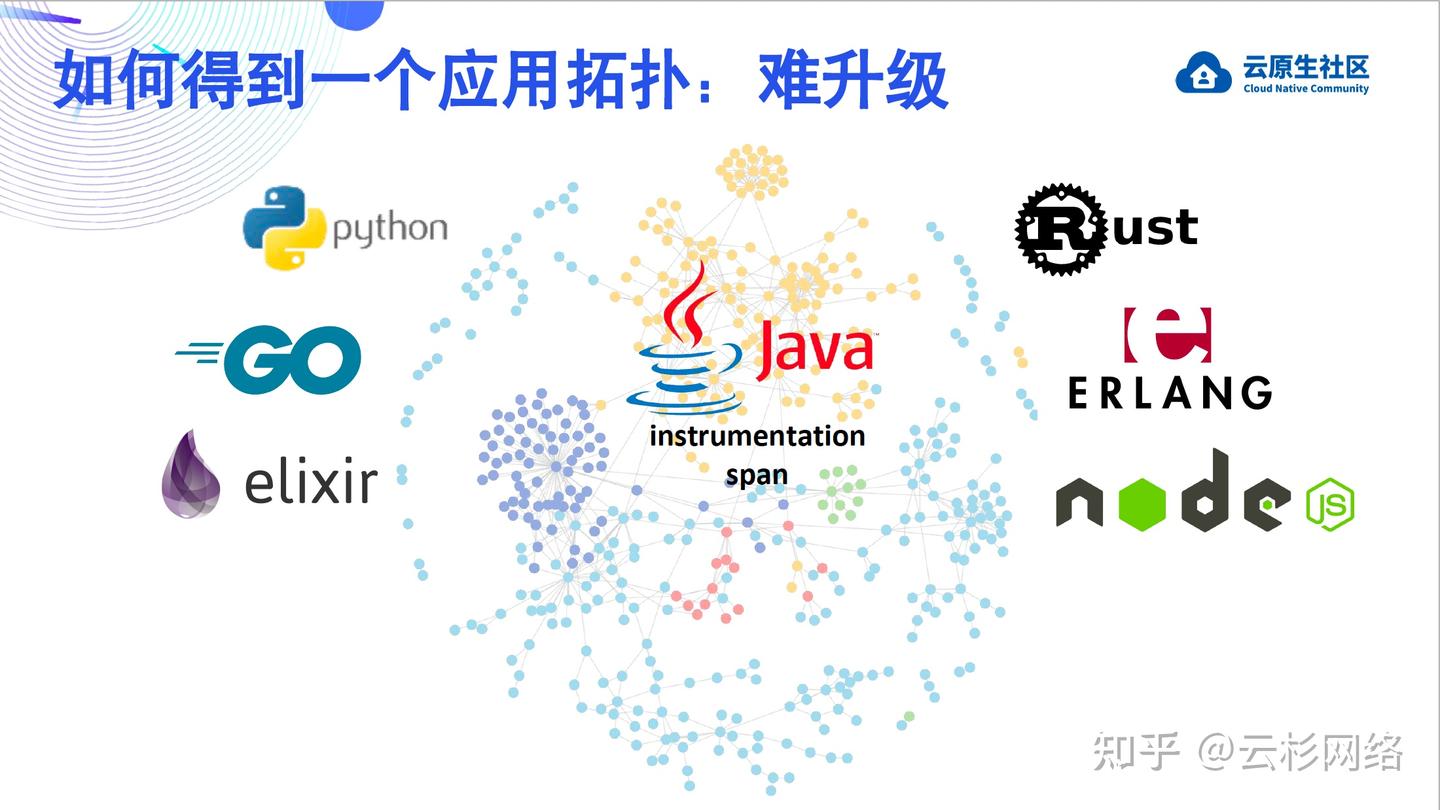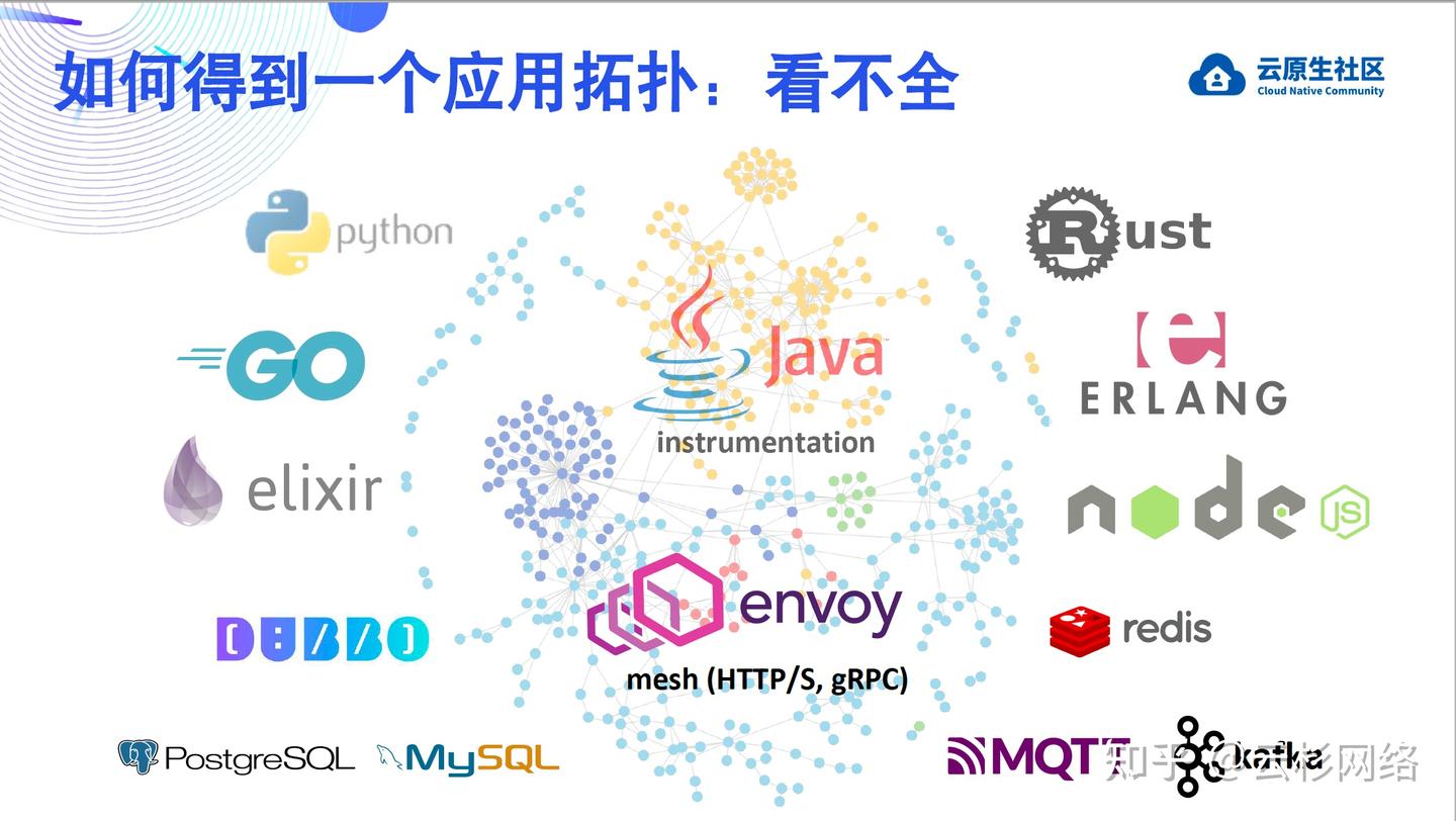 除此之外,在云原生时代,即使我们去改业务代码、上服务网格,仍然无法获取到一个完整的应用拓扑。比如云基础设施中的 Open vSwitch,K8s 中的 IPVS,Ingress 位置的 Nginx 网关,这些都是看不到的。