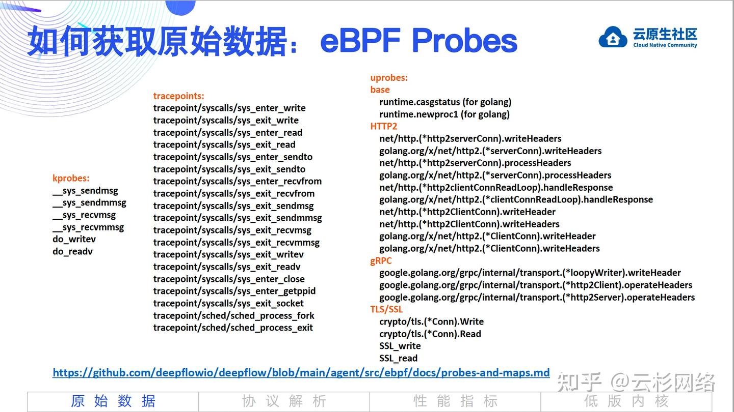 我们可以使用 eBPF 技术来覆盖所有的端节点,并使用 cBPF 覆盖所有的中间转发节点。从应用进程(端节点)层面,使用 kprobe 和 tracepoint 覆盖所有的 TCP/UDP socket 读写操作;并使用 uprobe 来挂载到应用程序内的核心函数上,比如 OpenSSL/Golang 的 TLS/SSL 函数,来获取加密或压缩之前的数据。