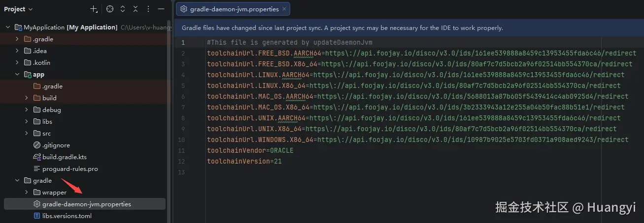 点击上述截图中的2处(Migrate),等待编译完成后,在gradle目录下会帮我们自动生成一个gradle-daemon-jvm.properties的文件,文件内容如下:
