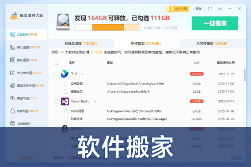 找到大文件后,您无需跳出工具:- 安全删除 :可直接将文件移至回收站 (非直接永久删除)。- 迁移引导 :对于可移动的大型文件夹(如 Steam 游戏库),工具可能提供迁移向导。- 重复文件查找:基于内容对比,找出分散在各处的重复项,这是手动无法完成的任务。