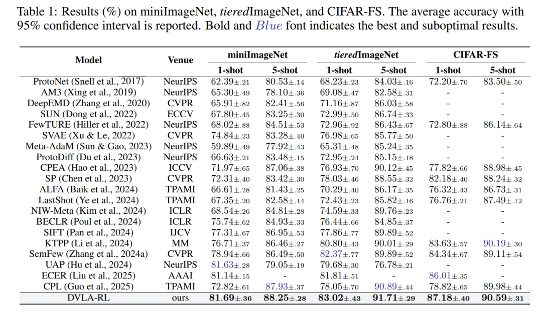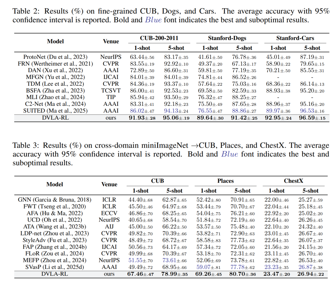 DVLA-RL在三类少样本学习场景的9个基准数据集上进行了全面验证,表现亮眼: