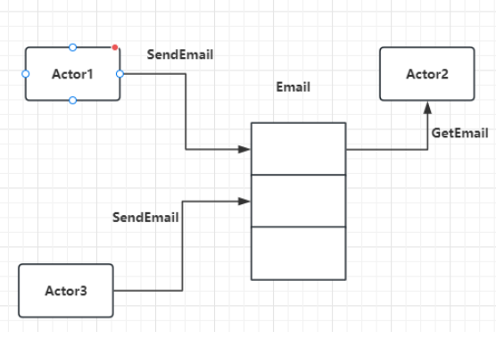 - 每一个类独立在一个线程里称作Actor,Actor之间通过队列通信,比如Actor1 发消息给Actor2, Actor2 发消息给Actor1都是投递到对方的队列中。好像给对方发邮件,对方从邮箱中取出一样。如下图