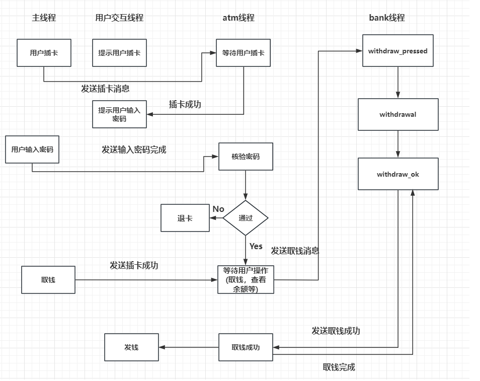 《C++并发编程实战》一书中提及了用csp思想实现atm机取款逻辑,我根据书中思想,整理了通信的示意图,书中部分代码存在问题,也一并修复了。
