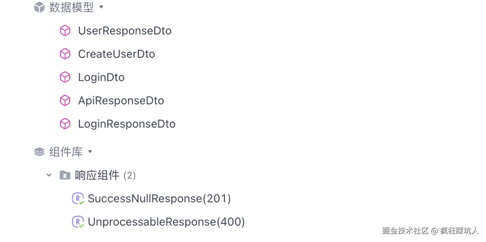 数据模型(这个是对应到服务端的DTO对象),最好是符合命名规范,对于query/body中的入参命名为XxxDto,对于响应结果命名为XxxResponseDto。 - 针对响应体结构,定义统一的响应组件:在apifox设计阶段,建立