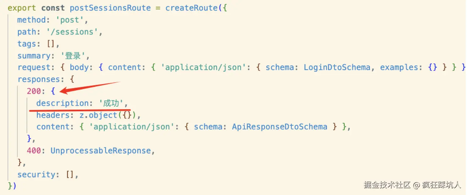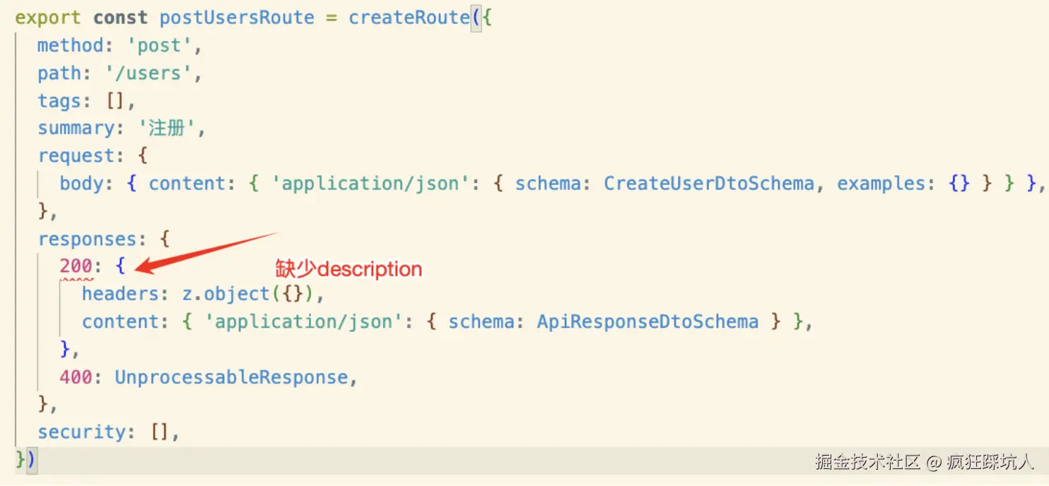 request.body.content可以发现schema 是内联的,这不利于复用zod schema(不利于类型复用)。同理 还有request.query、responses等。 - responses这里的响应体结构,没有做到复用。你可以看到