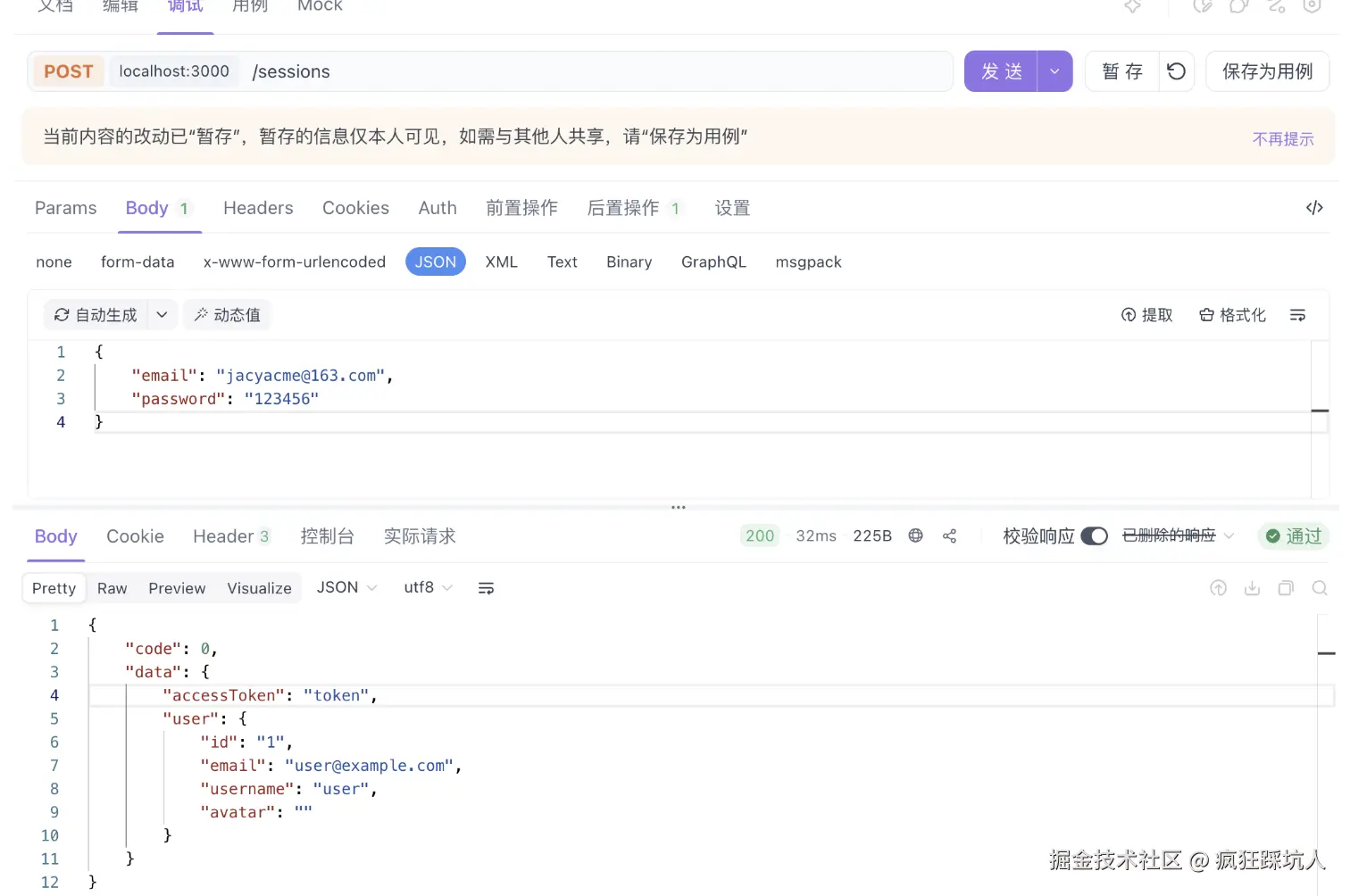 openAPI一般有两个导出形式json和yaml。这里简单起见,只放了1个登录接口(/sessions)的定义。