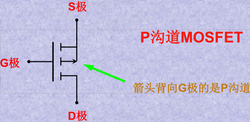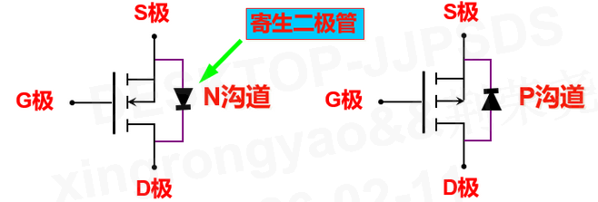 不论N沟道还是P沟道MOS管,中间衬底箭头方向和寄生二极管的箭头方向总是一致的: