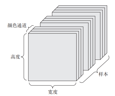 度图像的彩色通道只有一维,因此,如果图像大小为 256×256,那么 128 张灰度图像组成的批量可以保存在一个形状为 (128, 256, 256, 1) 的张量中