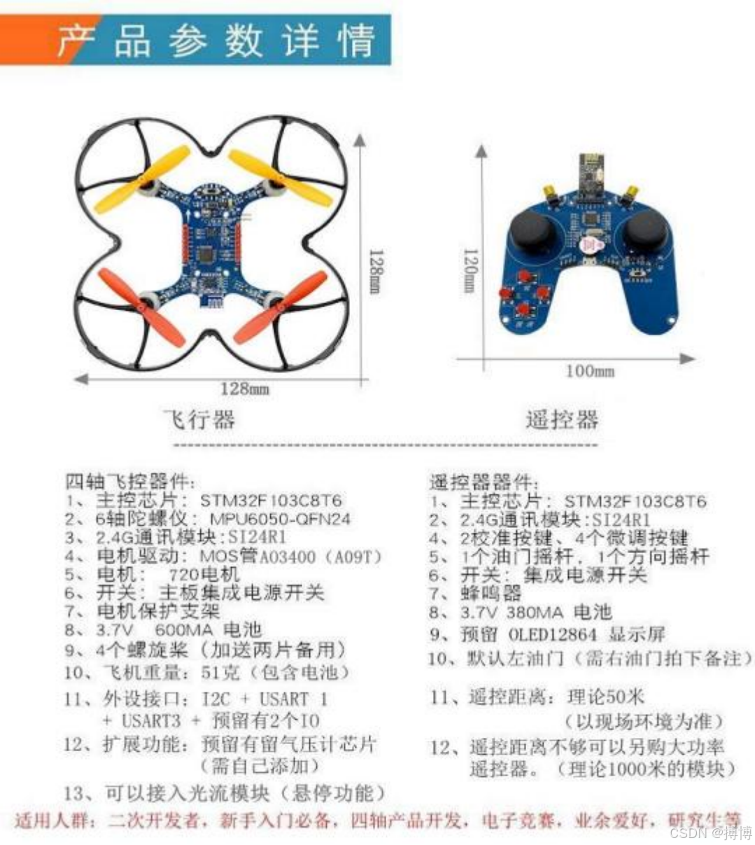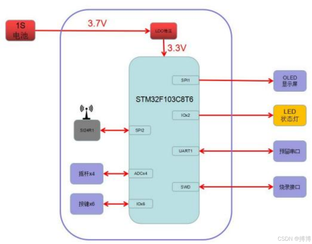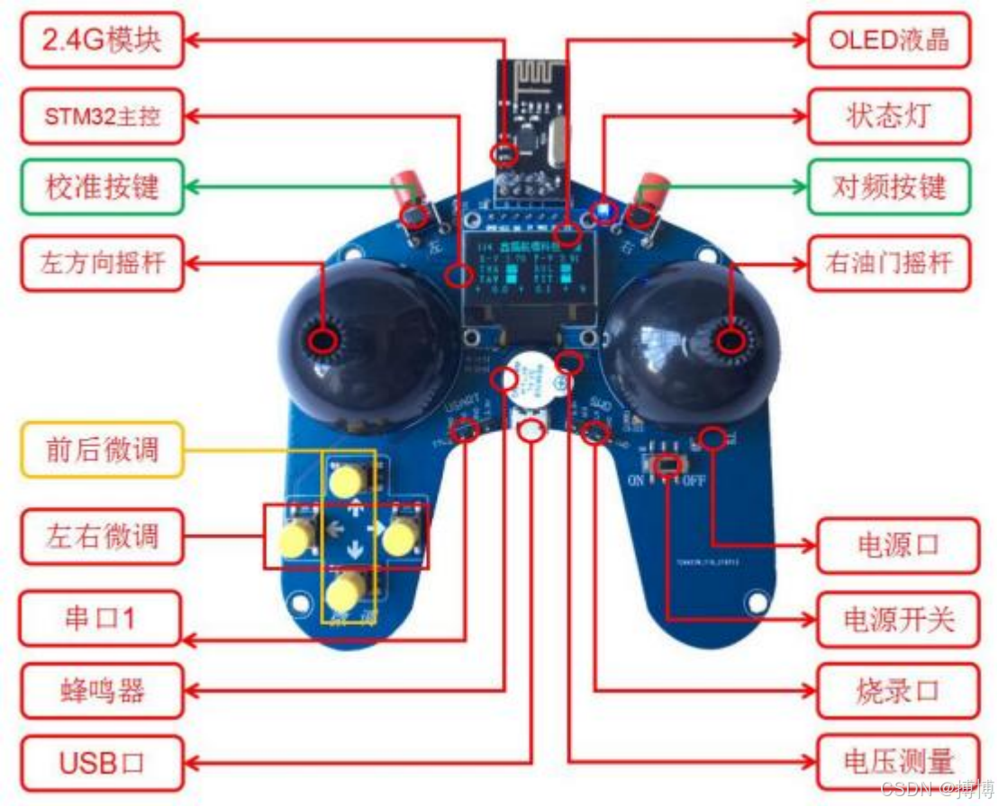 遥控器端使用与飞控相同型号的主控芯片,旨在降低开发者的学习成本,避免因芯片类型不同而增加额外的熟悉时间。