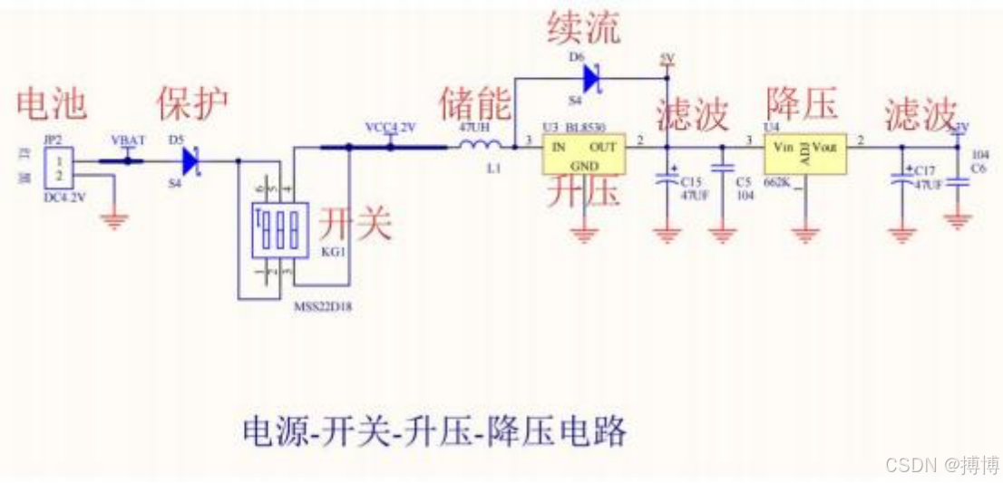 升压部分 采用BL8530 5V升压IC,该芯片需要搭配47uH的电感作为储能元件,其内部集成了类似BOOST拓扑的升压结构------BOOST升压电路是电路原理课程中的基本内容。此外,电路中的肖特基二极管起到续流作用,保证能量的连续传递。