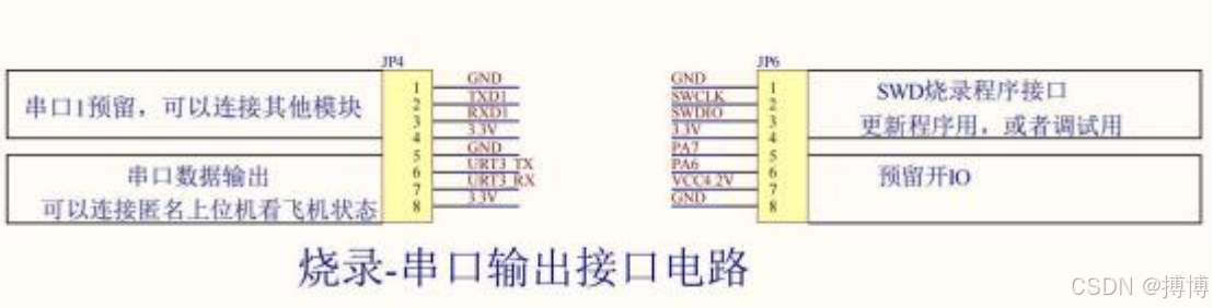 JP4为串口1/串口3复用接口。JP6为SWD烧录接口,也可用作两个通用IO口。