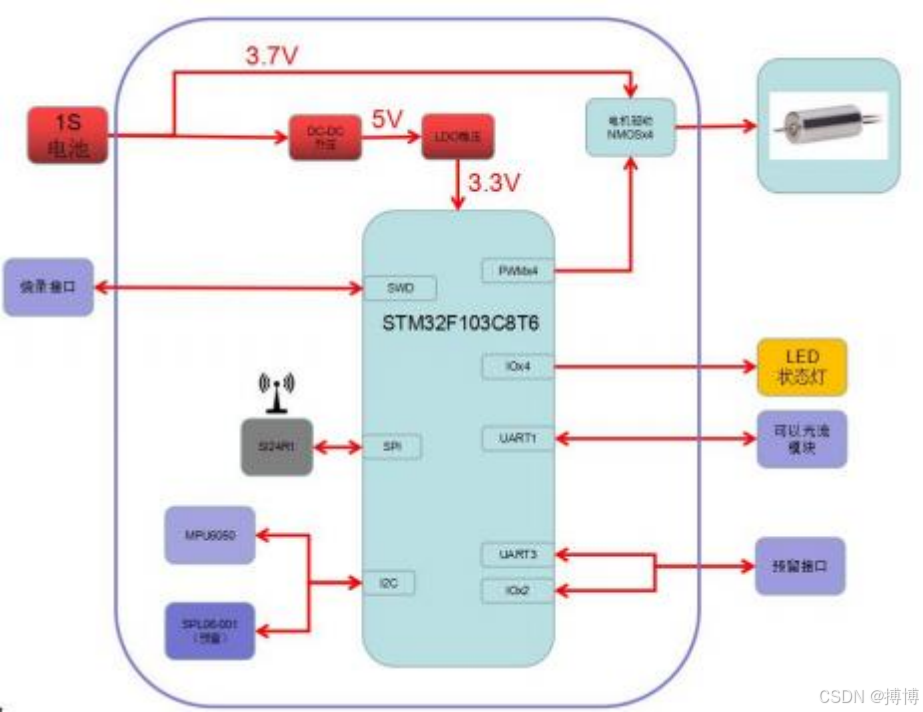 飞控系统供电电压采用3.7V标准1S锂电池。电源部分的工作原理如下: