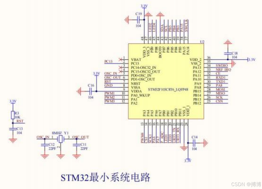 104电容 连接在3.3V电源引脚处,用作退耦电容。由于板上多个设备共用3.3V电源,可能产生相互干扰(即耦合干扰),退耦电容可有效抑制此类干扰。与RST引脚相连的电容为滤波电容,其作用是防止复位引脚电平波动引发误复位操作。