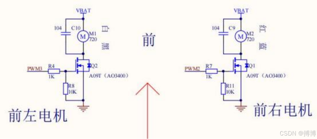 AO3400 为N沟道MOS管(NMOS),高电平导通,通过PWM信号的占空比可以调节其导通程度,进而控制电机的平均输出功率。该MOS管在门级开启电压为3.3V时,导通电流可达5.8A。