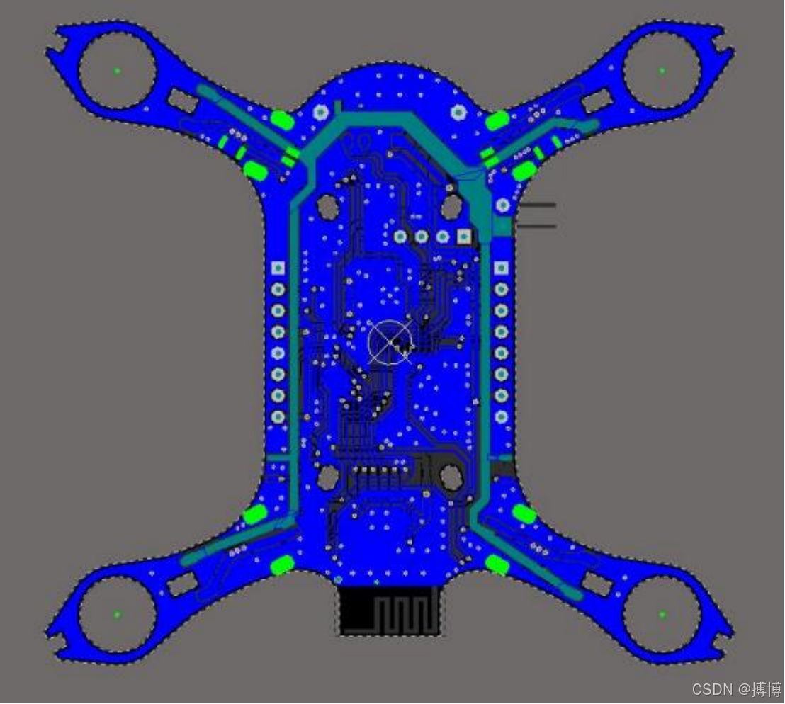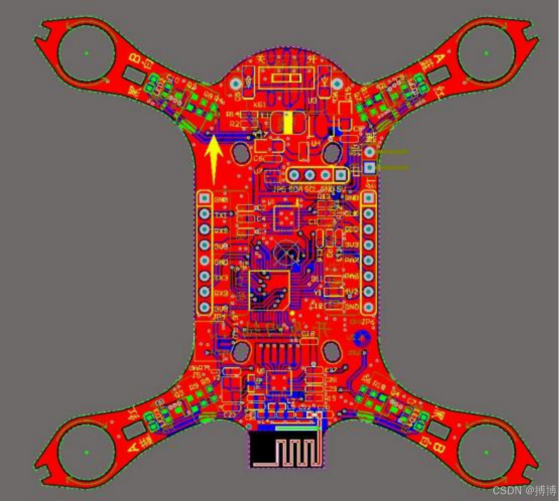(2)飞控板上射频天线所在区域需要进行避空处理,即其周围不应布置其他线路或元件,以保证信号传输的质量和稳定性。相关区域在图中也已用高亮标出。