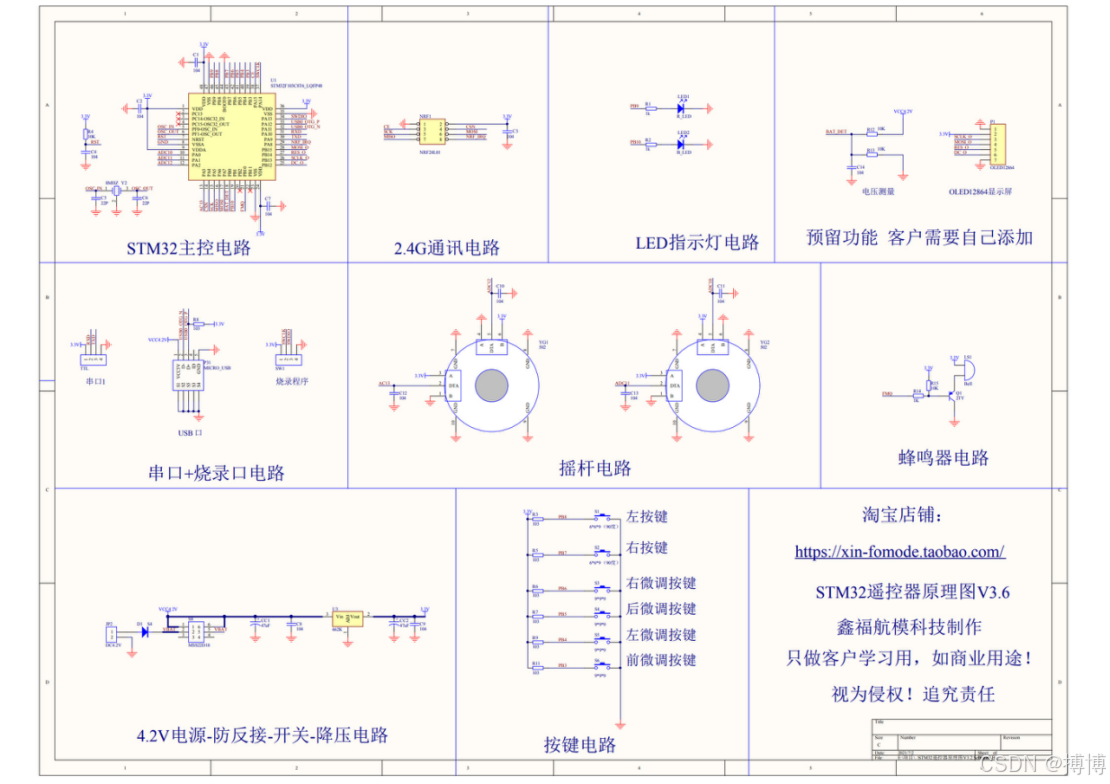 遥控整体电路结构设计相对简洁,主要包括2个模拟摇杆、6个功能按键、1个2.4G射频通信模块,此外还包含OLED显示屏接口、电池电压测量电路、电源降压转换电路、电源开关以及程序烧录接口等多个组成部分。