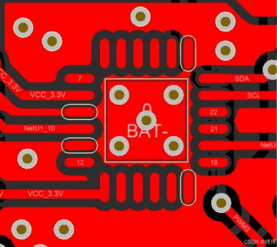 - 电池与电机之间的连接线路必须进行加宽处理。由于该线路通过的电流较大,足够的线宽能够有效减少线路电阻,避免过热。具体可参考图示中高亮标注的部分。