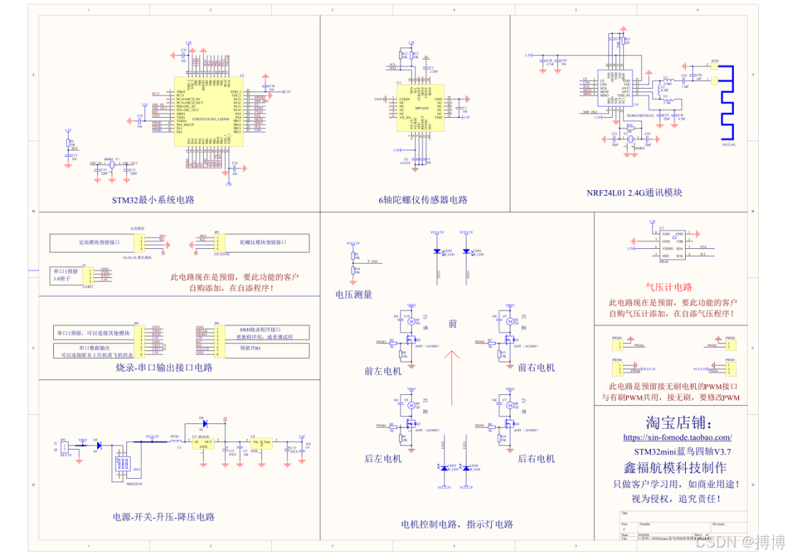飞控整体电路主要包括电源管理模块、电机驱动电路、STM32最小系统、MPU6050传感器模块及其它外围接口电路。气压计系统、2.4G通讯系统、电池电压测量电路,以及串口、SPI接口等多个功能模块共同组成了该系统的硬件基础架构。STM32mini蓝鸟四轴原理图V3.7如下: