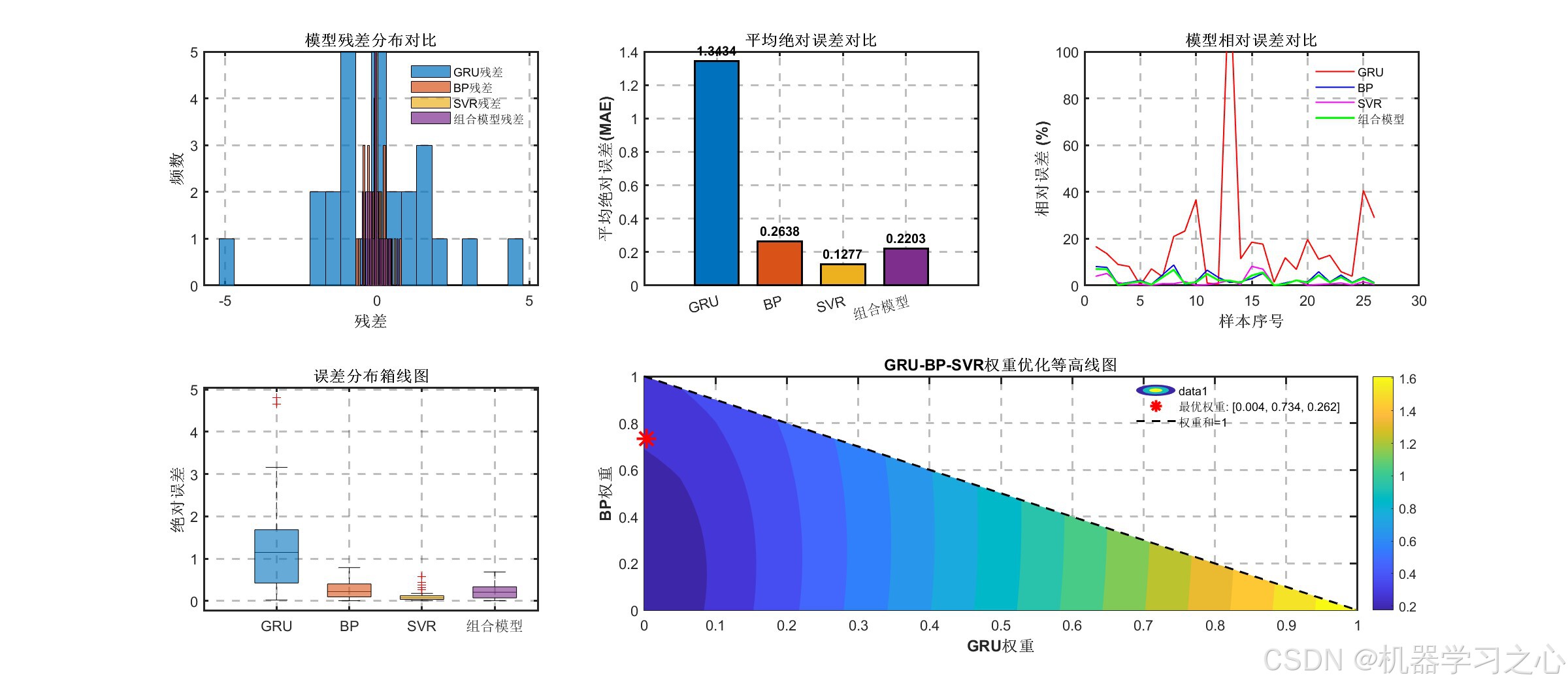 y^comb=wGRU⋅y^GRU+wBP⋅y^BP+wSVR⋅y^SVR \hat{y}{\text{comb}} = w{\text{GRU}} \cdot \hat{y}{\text{GRU}} + w{\text{BP}} \cdot \hat{y}{\text{BP}} + w{\text{SVR}} \cdot \hat{y}_{\text{SVR}} y^comb=wGRU⋅y^GRU+wBP⋅y^BP+wSVR⋅y^SVR