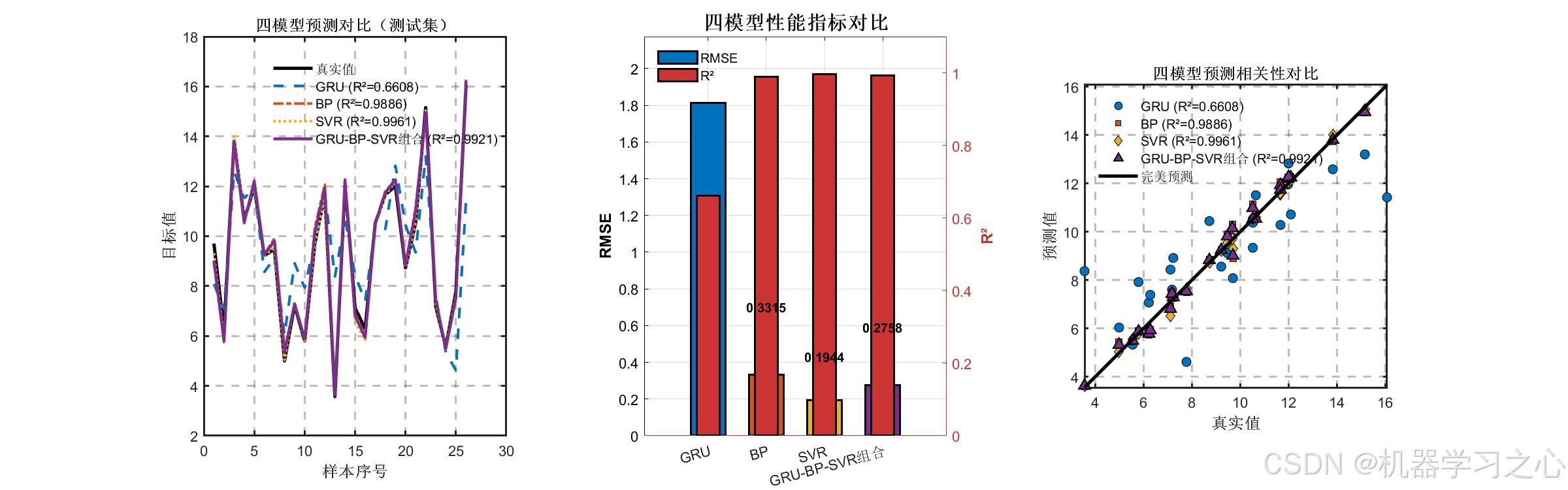 模型兼顾了时序依赖(GRU)、非线性映射(BP)和小样本稳健性(SVR),通过加权集成进一步提升精度与鲁棒性。
