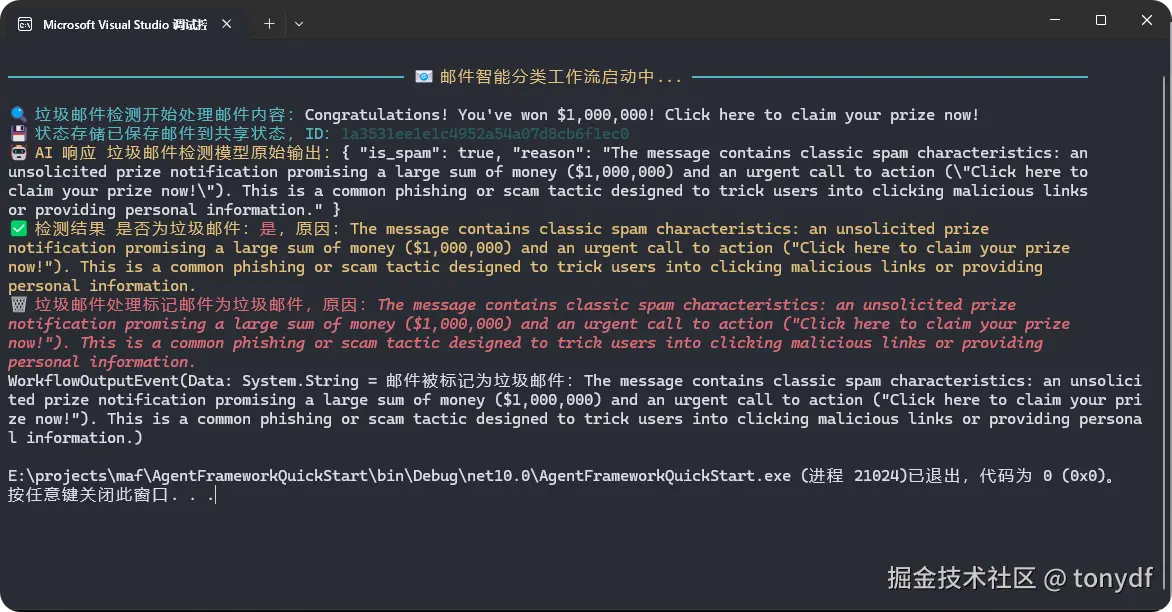- 垃圾邮件分析:垃圾邮件检测代理会对邮件进行分析,并返回一个包含IsSpam和Reason属性的结构化DetectionResult。