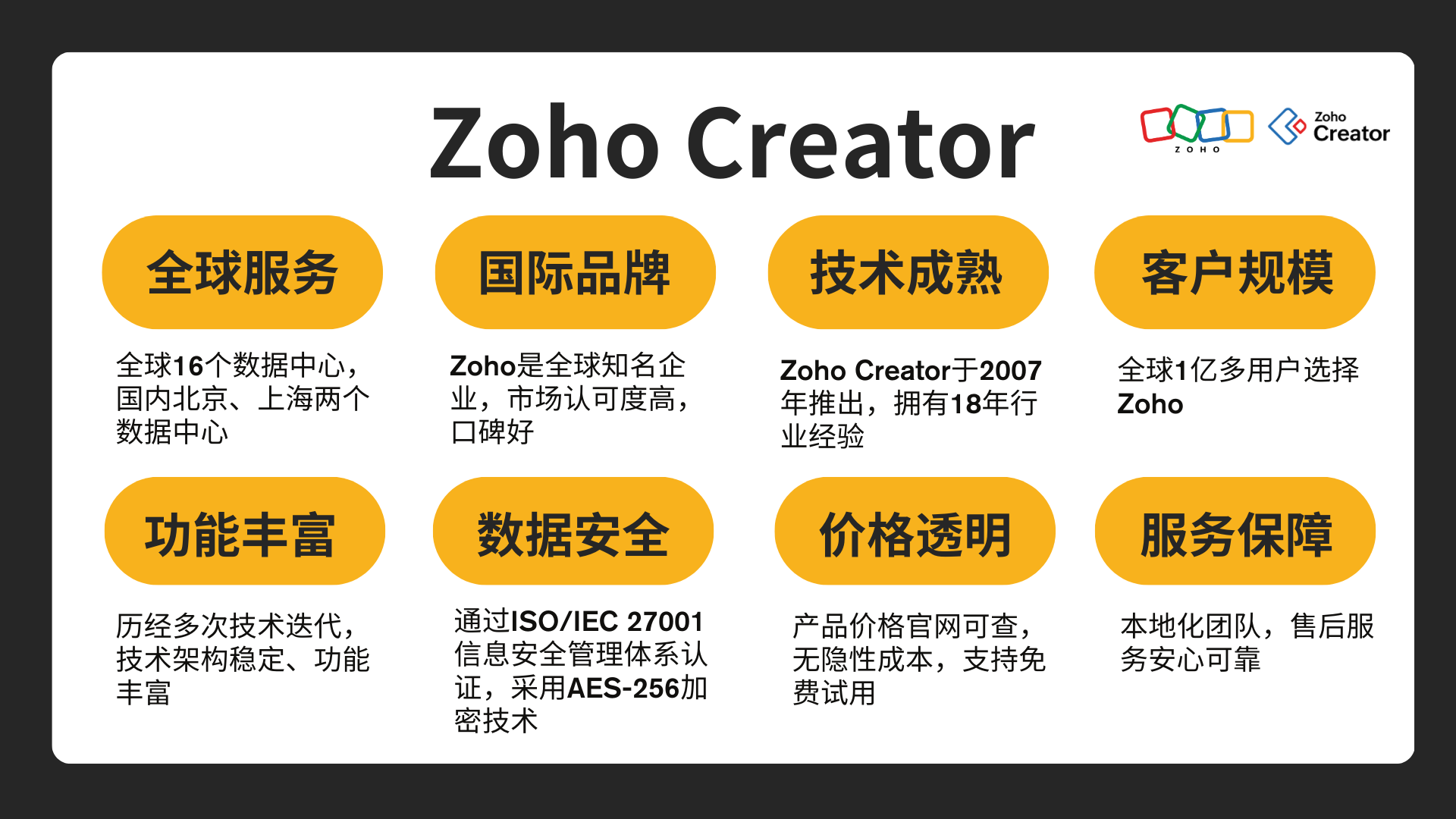 在众多低代码平台中,Zoho Creator是少数能够真正做到"国内外通吃"的选项。它不仅具备强大的国际化基因,还在中国市场深耕多年,兼具全球视野与本土服务能力。