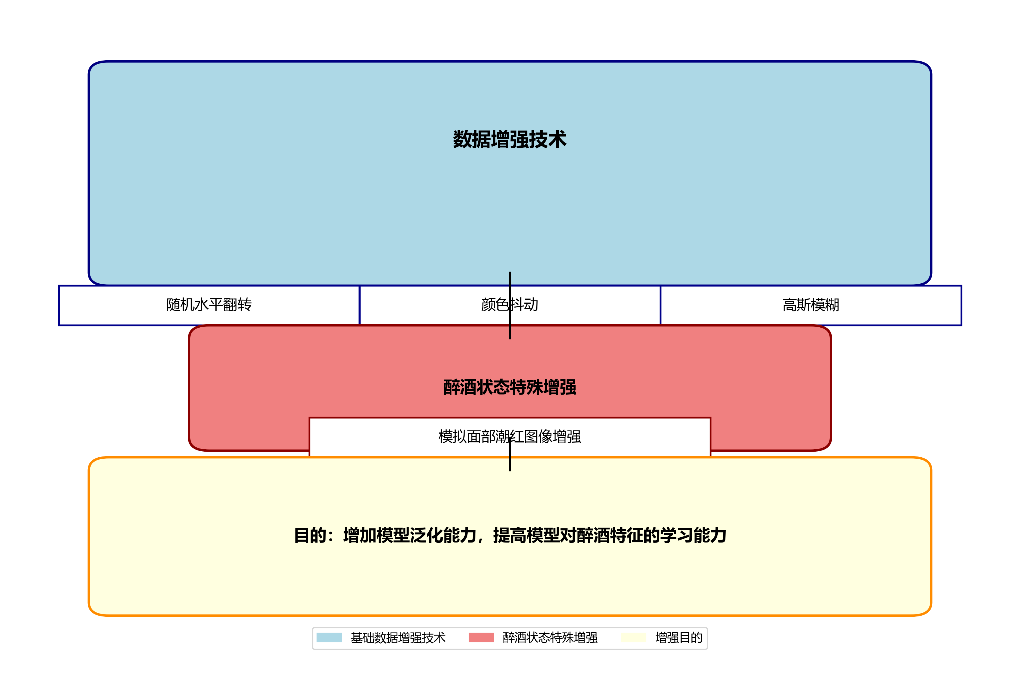数据增强方面,我们采用了随机水平翻转、颜色抖动、高斯模糊等技术,以增加模型的泛化能力。特别是在处理醉酒状态时,我们特别增加了模拟面部潮红的图像增强技术,以提高模型对醉酒特征的学习能力。
