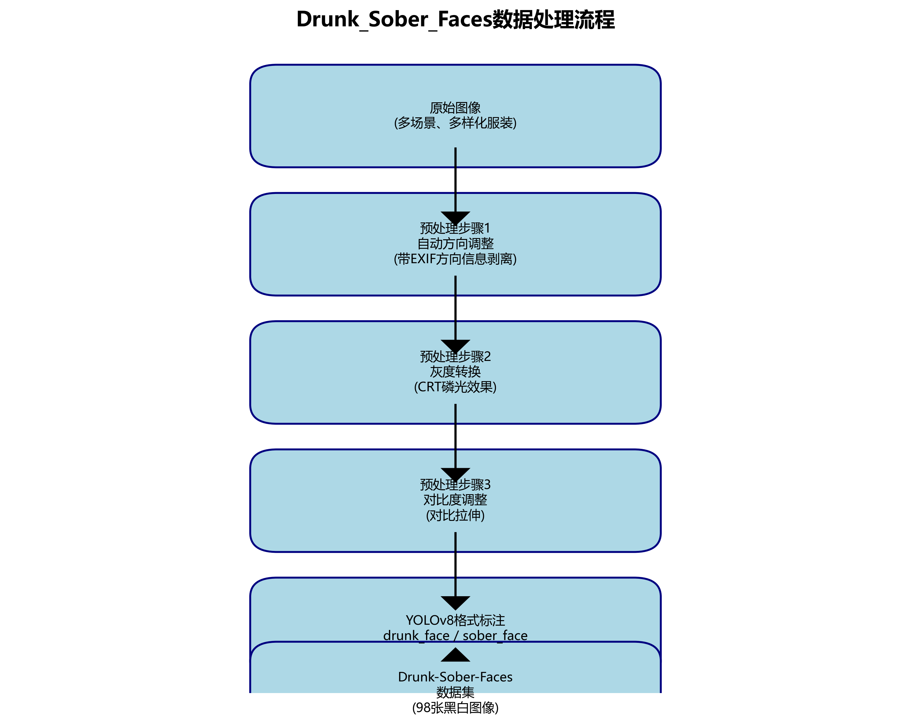 高质量的数据集是模型训练的基础。我们构建了一个包含10,000张图像的人脸醉酒状态数据集,其中5,000张为醉酒状态,5,000张为清醒状态。数据集采集来自不同场景、不同光照条件和不同角度的图像。📷