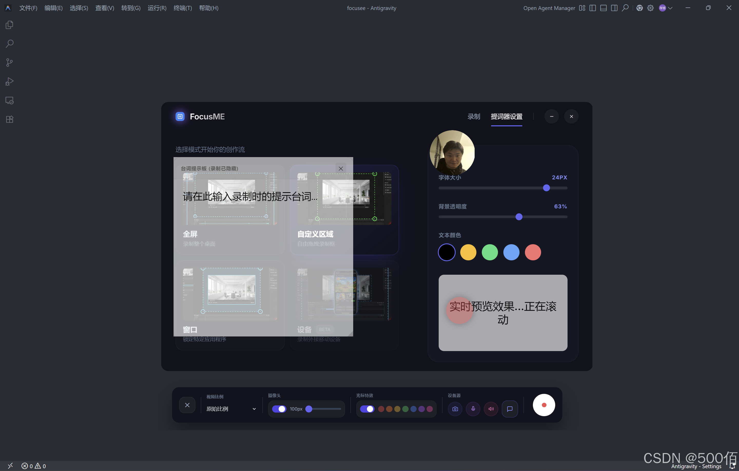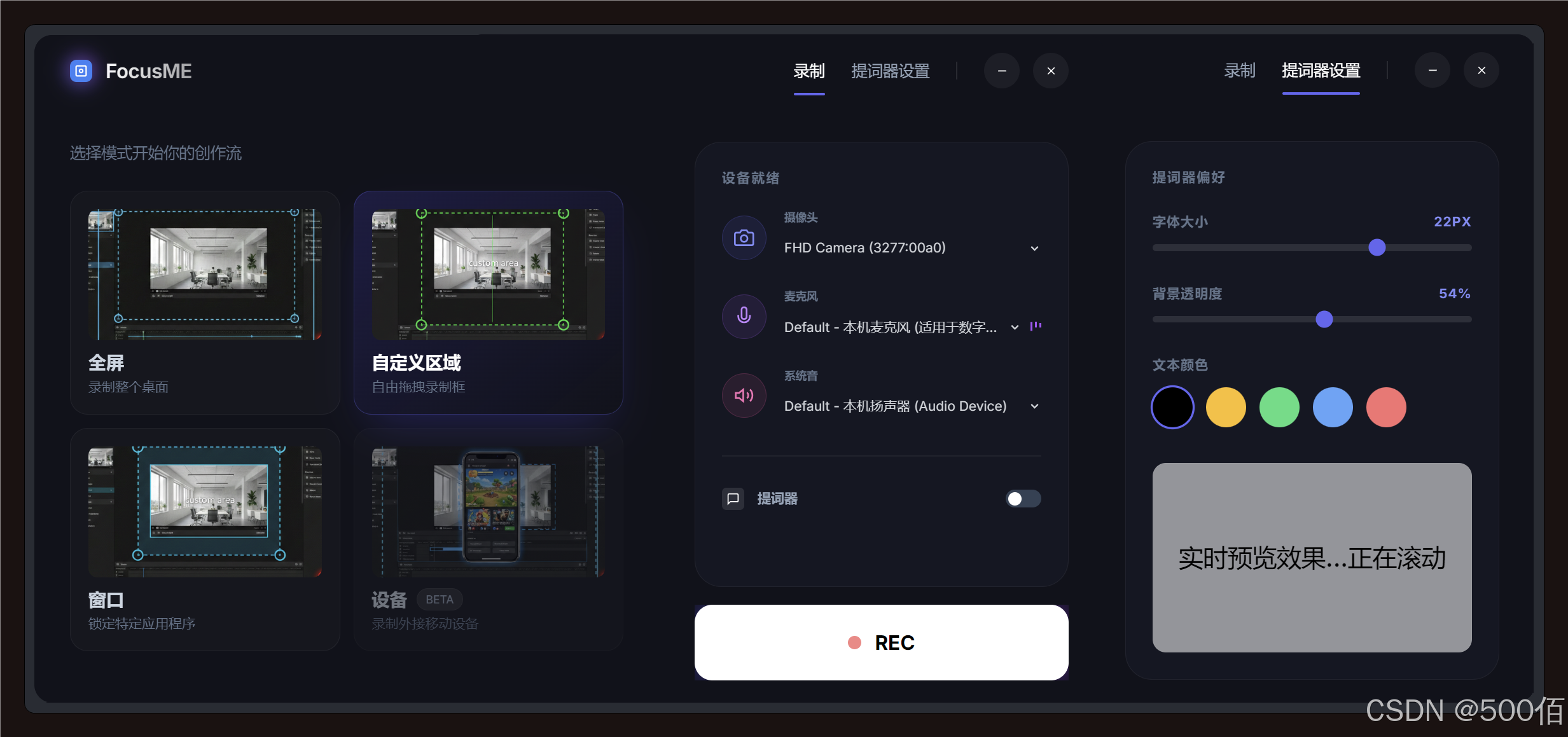 提词器偏好设置,台词板子的字体大小、字体颜色,板子的透明度调节。 -