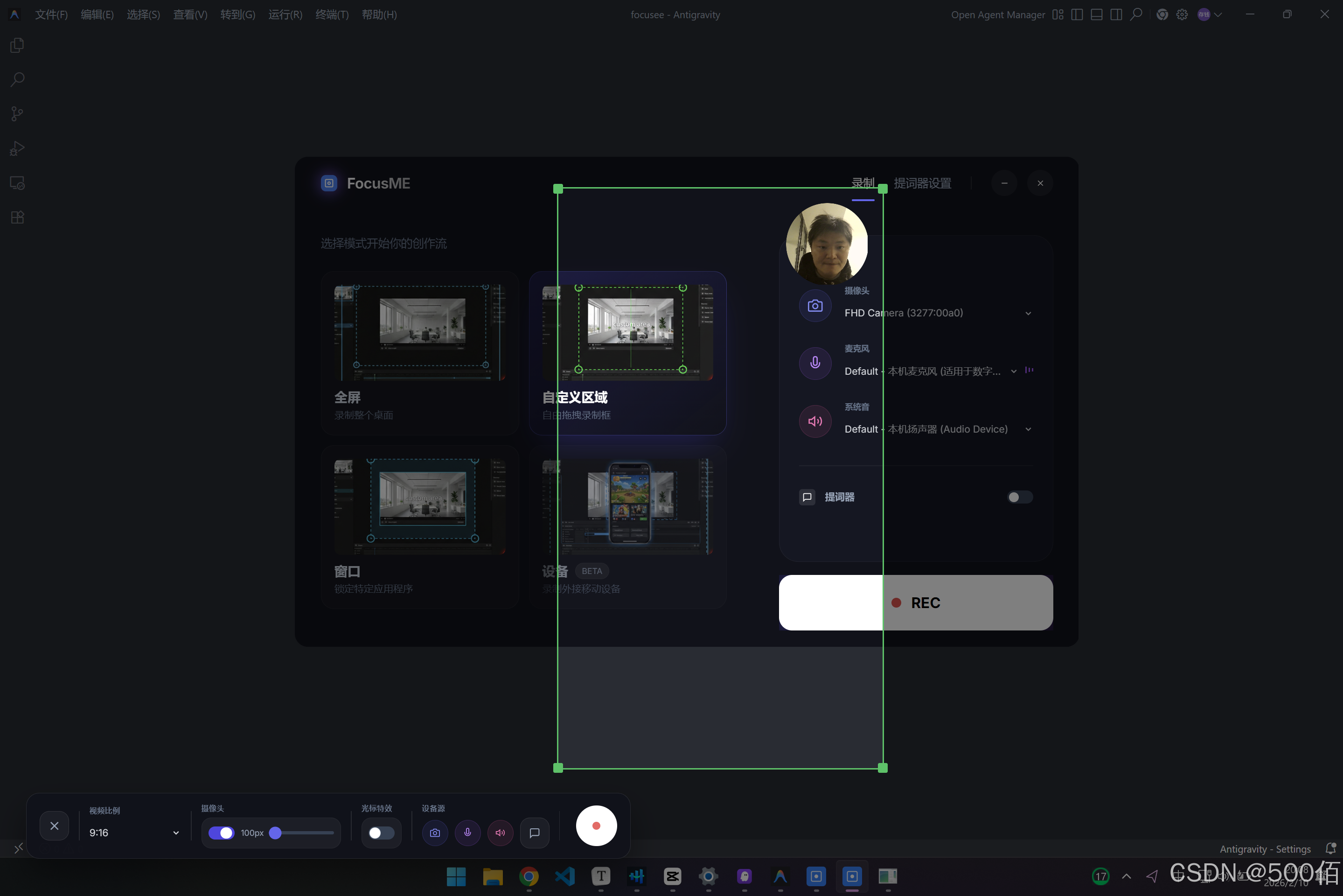 录制模式选择区,有4张卡片(全屏、自定义区域、窗口、移动端设备),点击其中一个卡片,进入到录制设置工具栏。