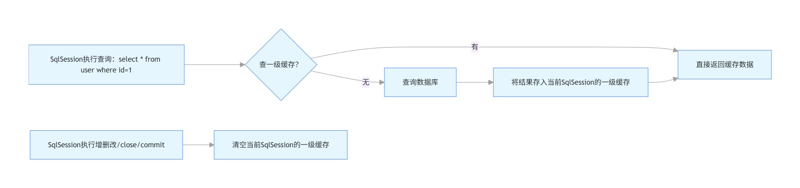 ✏ 同一个 SqlSession 执行第一次查询:缓存中无数据 → 查数据库 → 结果存入一级缓存 → 返回数据