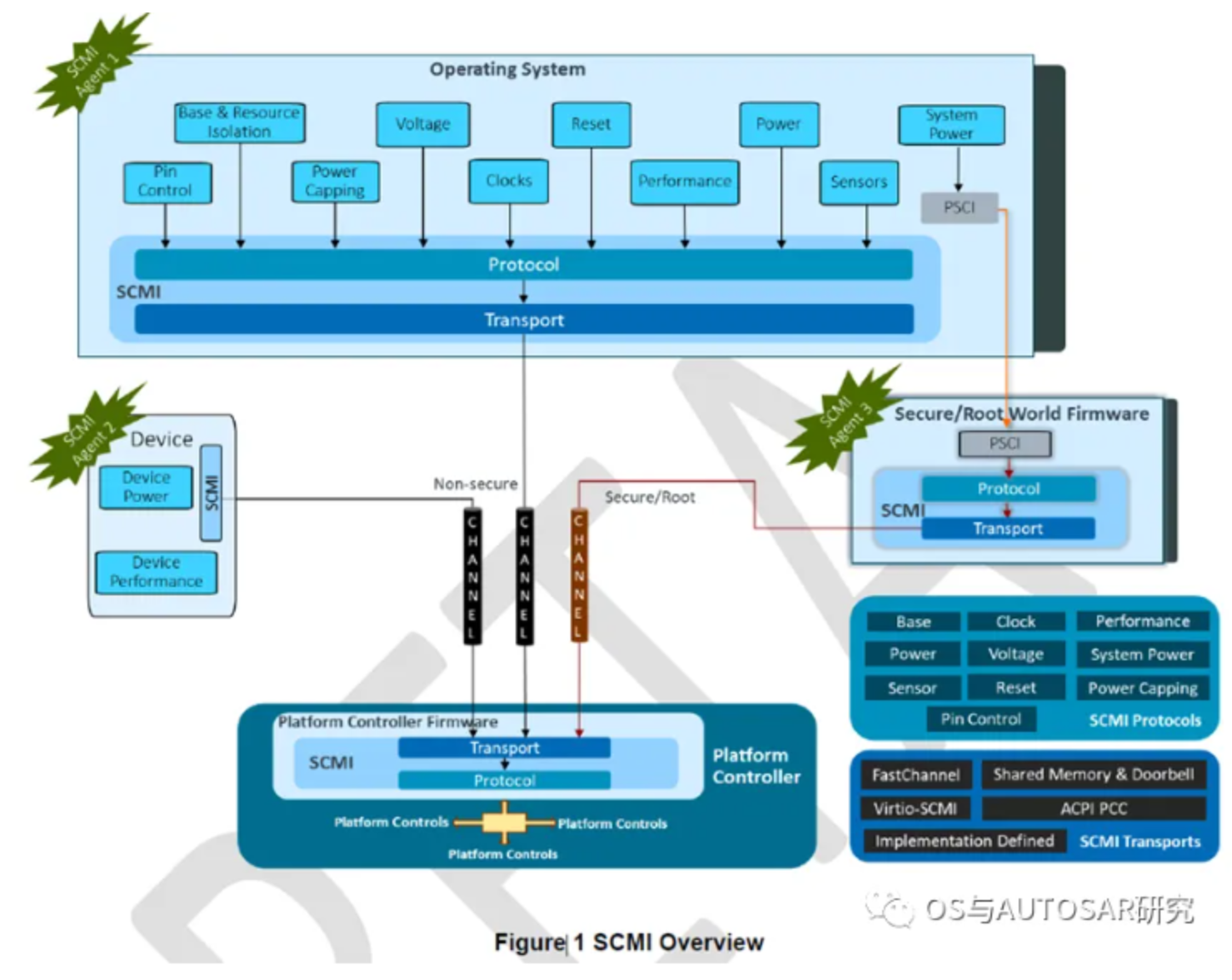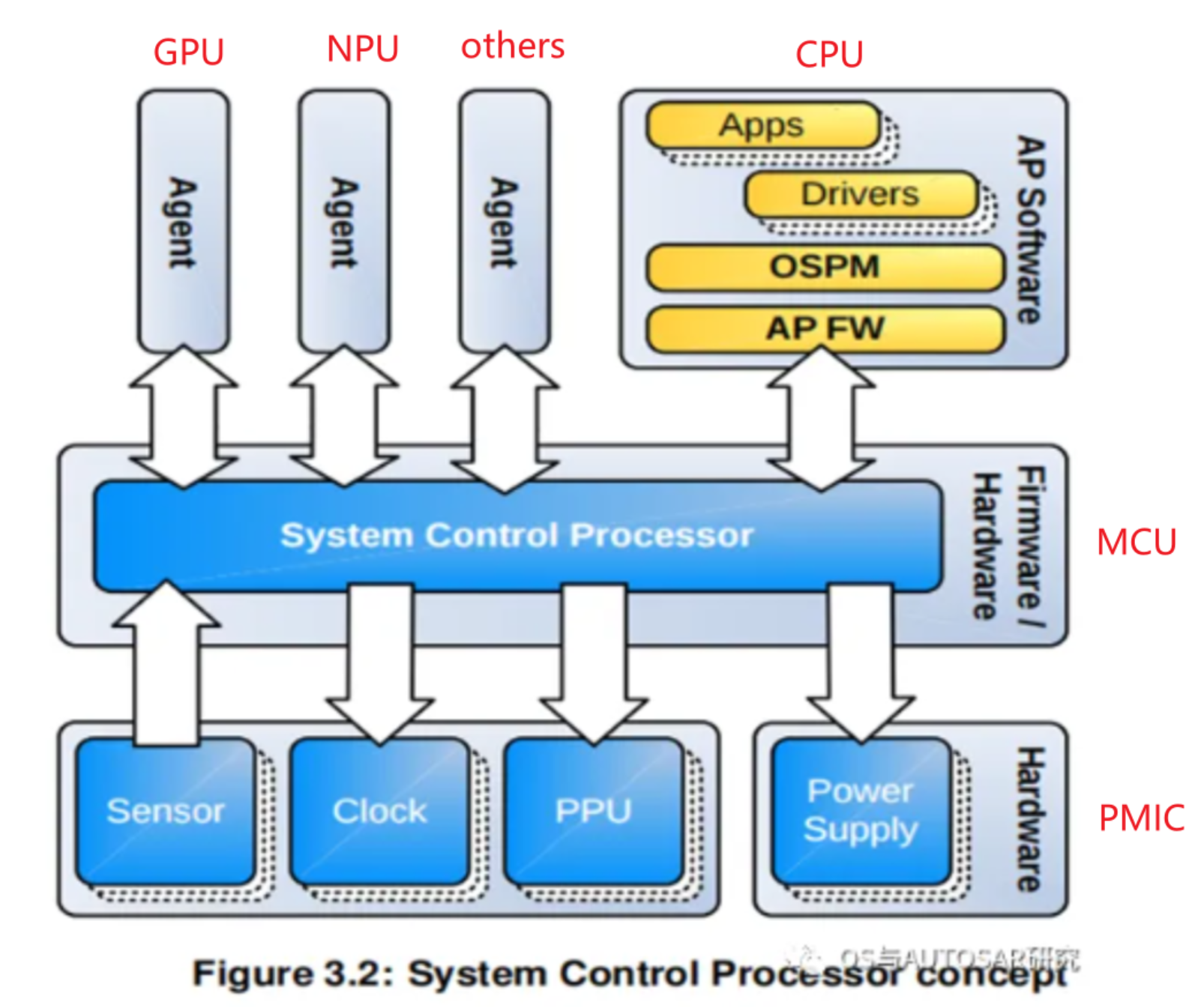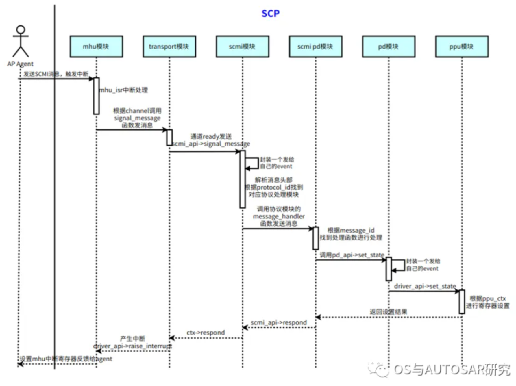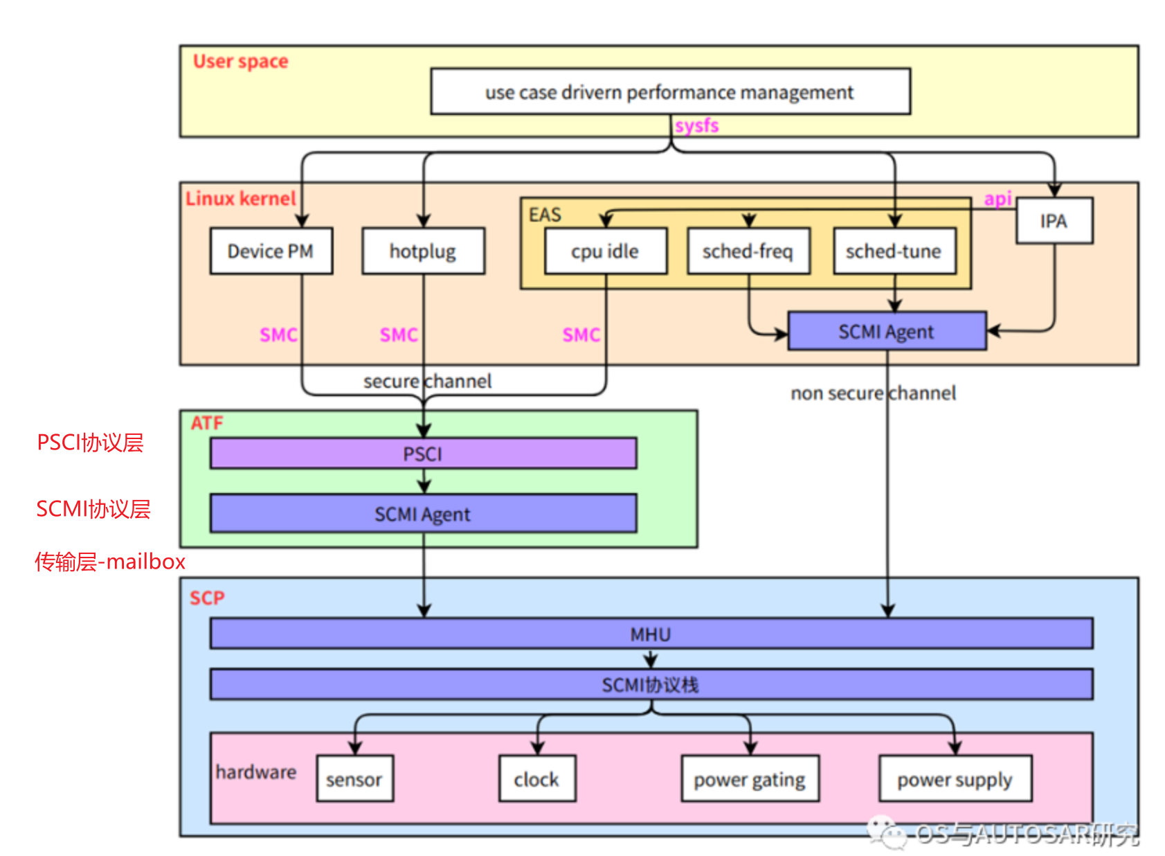 - 最底层是SCP控制的硬件资源,例如时钟源、电源域门控、电压电压和传感器等