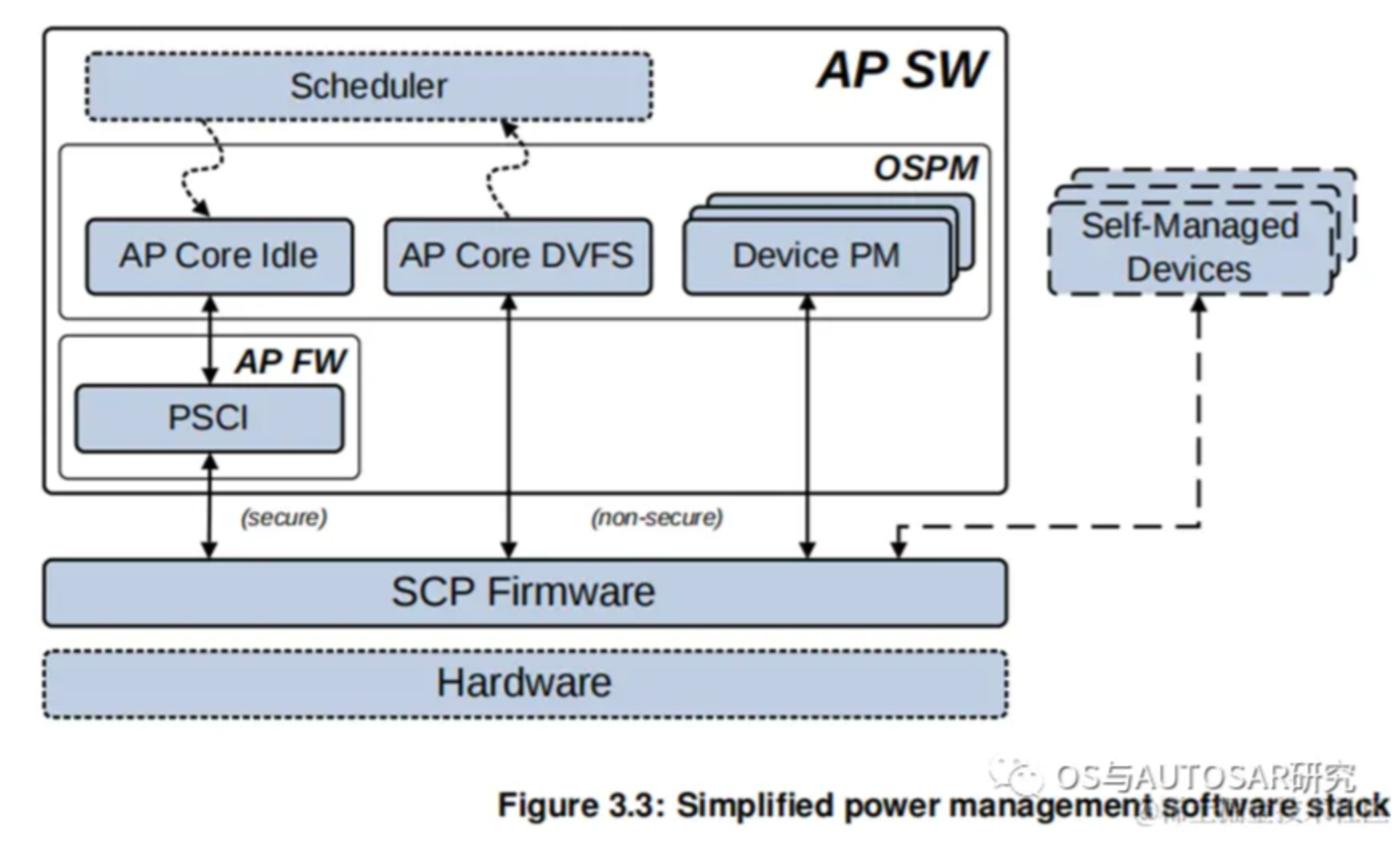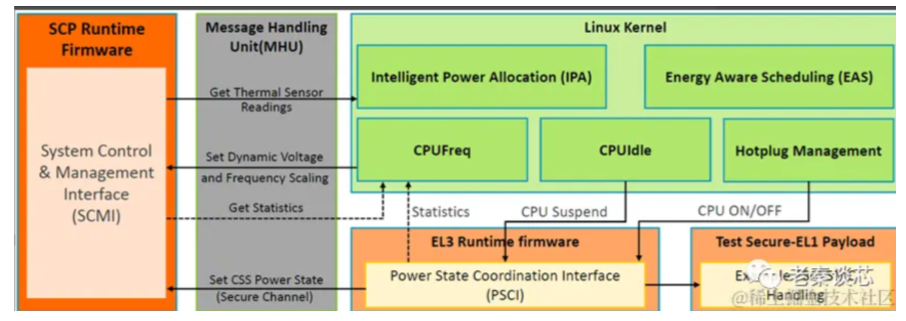 Linux kernel中发起的操作,会经过电源状态协调接口(Power State Coordination Interface,简称PSCI),由操作系统无关的framework(ARM Trusted Firmware,简称ATF)做相关的处理后,通过系统控制与管理接口(System Control and Management Interface,简称SCMI),向系统控制处理器(system control processor,简称SCP)发起低功耗操作。