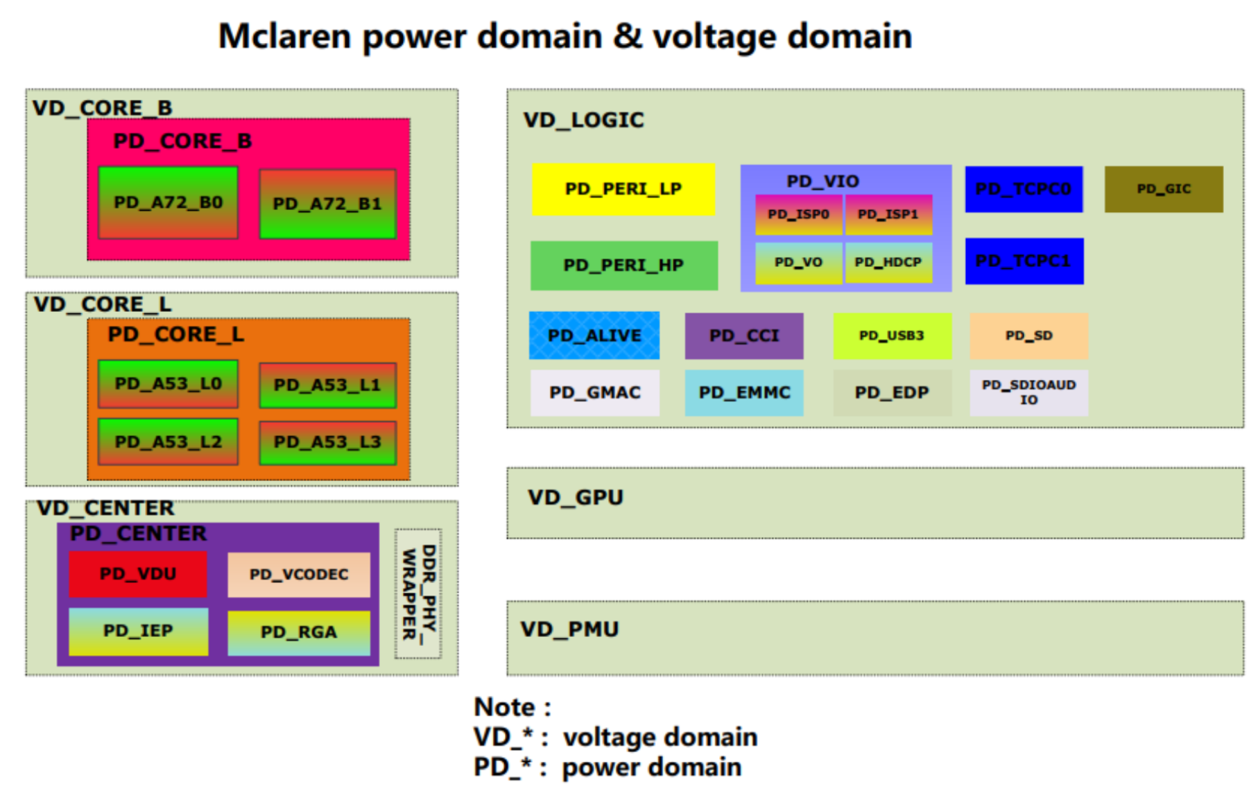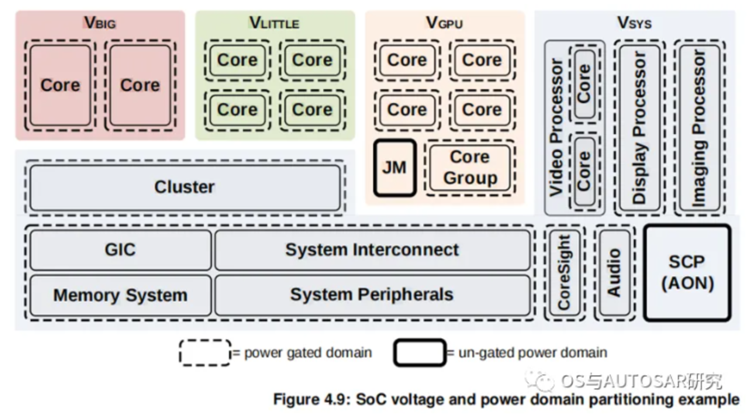 如上图,不同颜色表示不同的电压域,VBIG是大核处理器的电源供电,VLITTLE是小核处理器的电源供电,VGPU是图形处理器的电源供电,VSYS是系统电源。虚线框包围的模块表示可以做电源开关处理,比如处理器核。实线框包围的模块表示不能做电源开关,比如SCP。