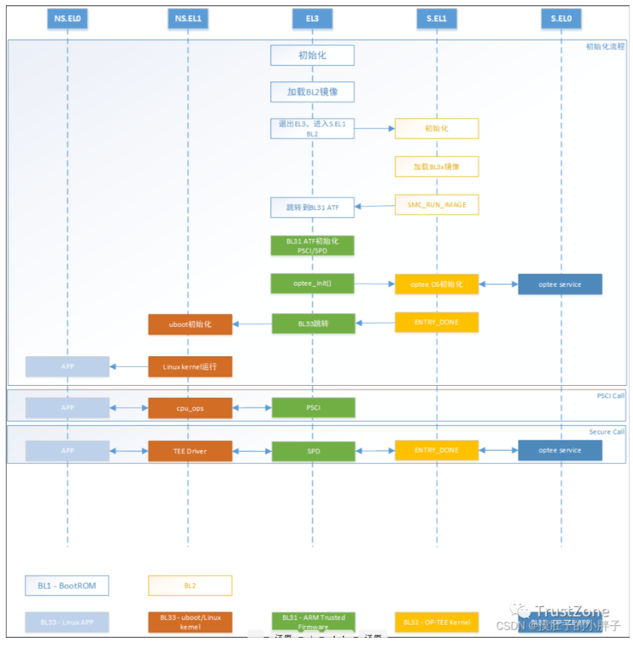 • BL31 - EL3 Runtime Firmware,一般为SML,管理SMC执行处理和中断,运行在secure monitor中。