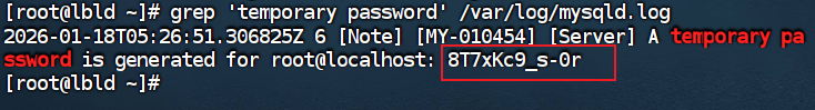 bashgrep 'temporary password' /var/log/mysqld.log输出示例:
