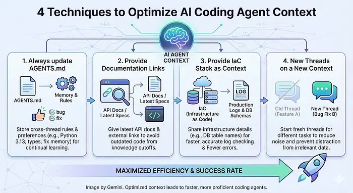 这张信息图突出了本文将介绍的主要技巧,你可以使用这些技巧让你的编程智能体更高效。首先,我将讨论你应该如何始终更新AGENTS.md,其中包含跨线程相关的上下文。此外,我将讨论如何提供文档链接并提供IaC堆栈作为上下文。最后,我还将介绍为什么在新上下文工作时应该始终启动新线程。