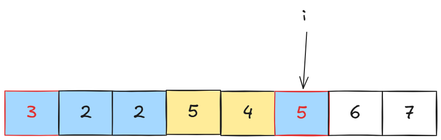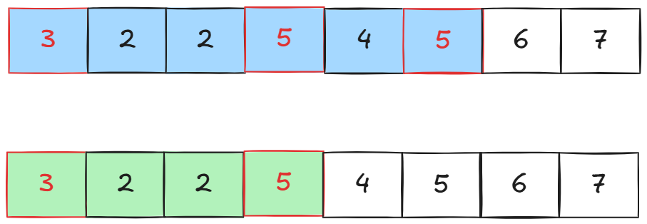 所以我们的想法是,重复出现的数字中,只有最后一个数字是有效的,因此当我们的区间更新到: