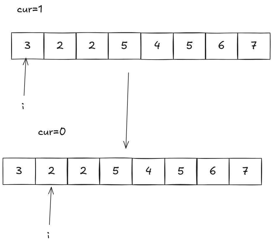 cur:当前遍历到i位置时的「累计差值」(奇数 + 1、偶数 - 1);