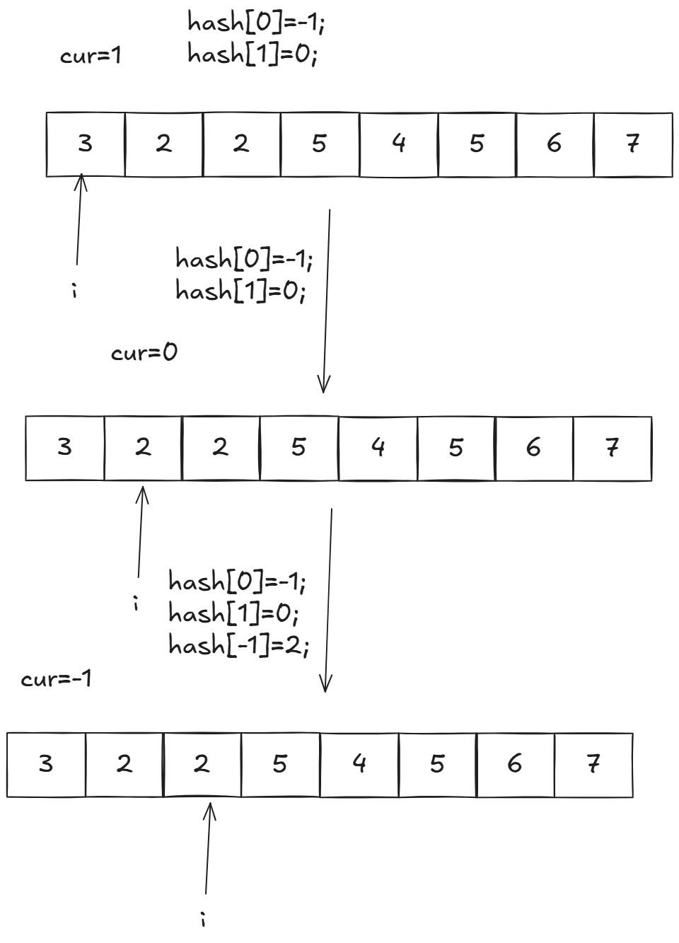 我们遍历到这个位置的时候,cur=-1,此时我们哈希表里-1对应的下标是2.那么[2+1,i]这个区间就是奇偶数个数平衡的。