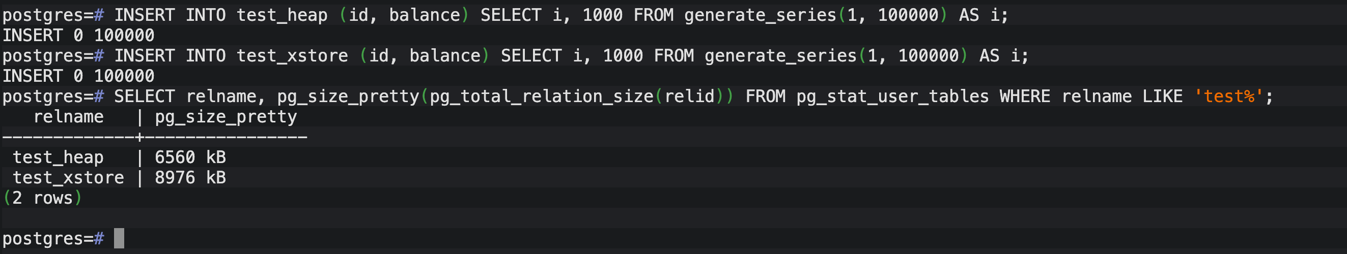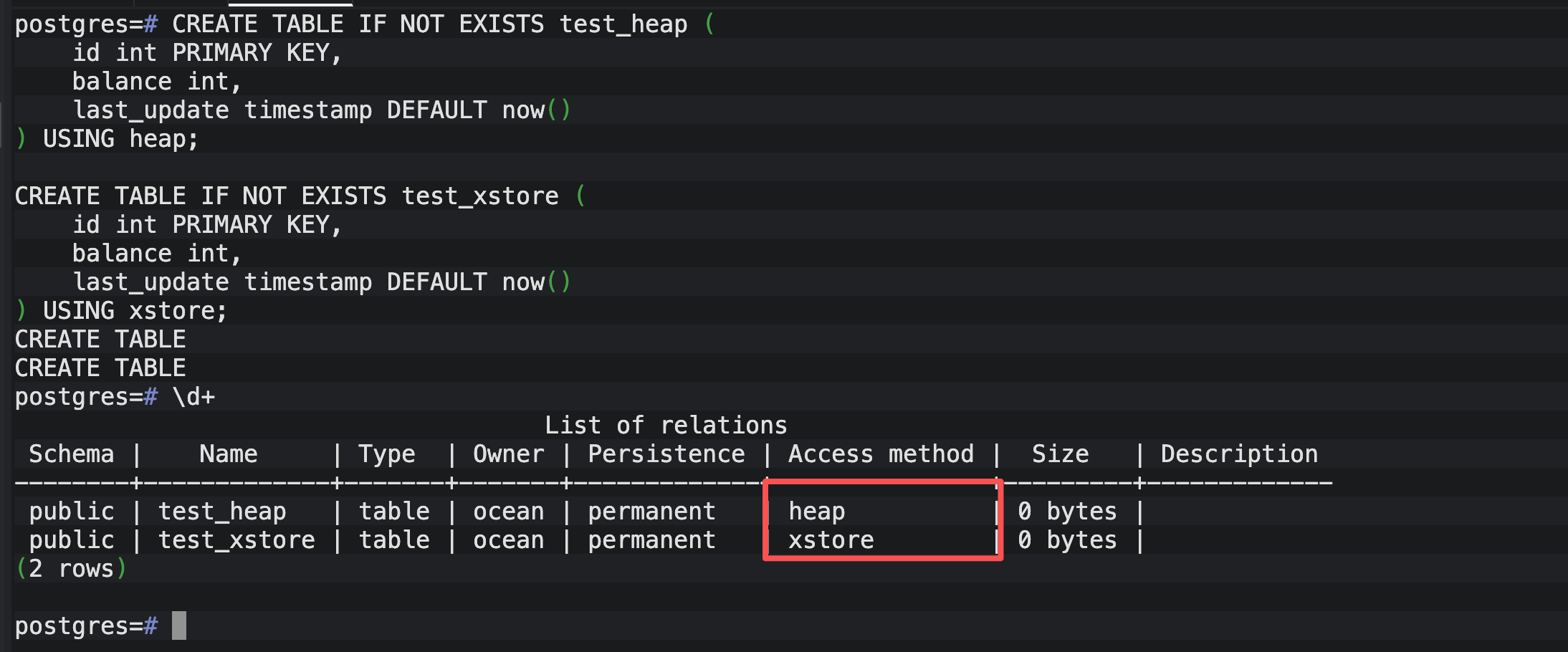 通过 \d+ 命令,我确认了 test_xstore 的 Access method 确实显示为 xstore。这是 OpenTeleDB 区别于原生 PG 的核心标志。