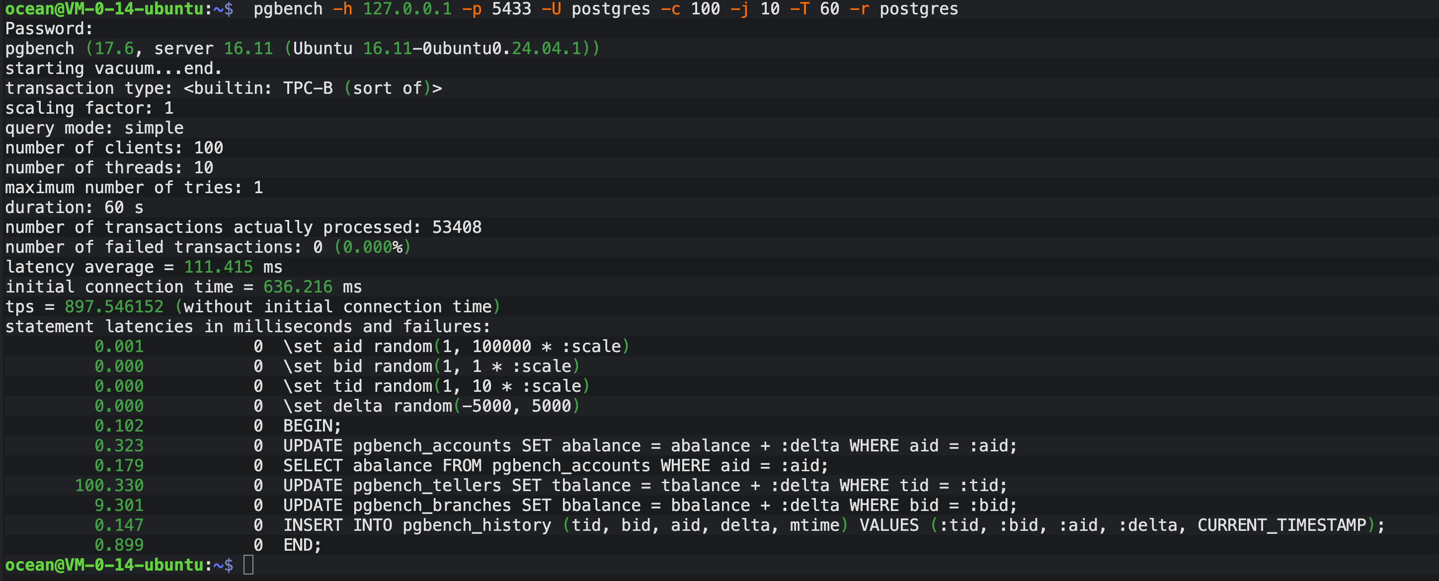 OpenTeleDB 的 XStore 号称无死元组,那么它的性能曲线真的能像"心电图"一样平稳吗?我决定用 pgbench 做一次长达 5 分钟的持续施压。