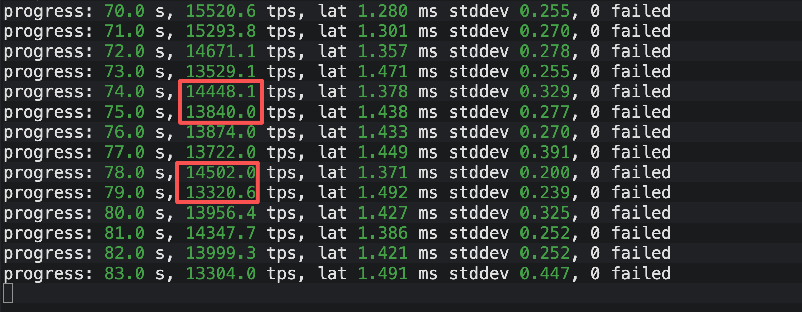 - 仅仅几秒后的第 79 秒,TPS 迅速下探至 13320。