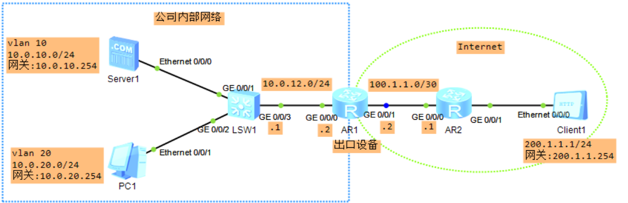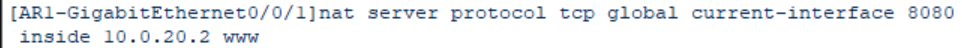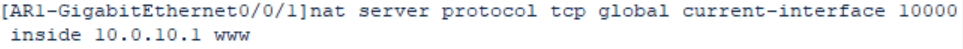 - 目前client 1不能访问server 1,需要在AR1上配置NAT Server。公网想要访问内网的server 1(10.0.10.1 端口号-web网的),目的IP做一个转换,访问当前接口的IP(端口号为10000,可以自己定,不容易被攻击) http服务是基于tcp协议的。