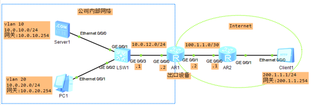 - 配置AR1的路由,网络小,静态路由即可 ,分别通向Server1和PC1的路由,保证回包的路线是通的。公司内部网络中LSW1和AR1、Server1、PC1是直连路由,不用再设置静态路由信息。